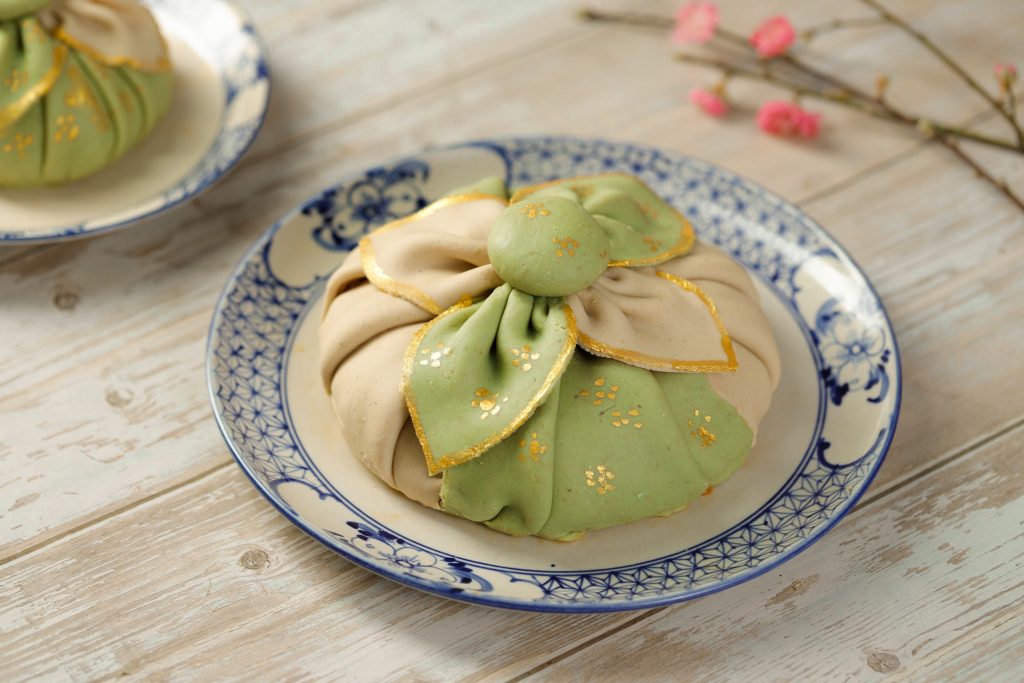Cho bột đậu đã nguột bớt ra thảm nhào bột, dùng tay nhào sơ lại. Chia đôi khối bột thành hai phần có kích cỡ bằng nhau, một phần nhào với màu thực phẩm trắng, một phần nhào với bột trà xanh cho tới khi đều màu. Phủ một cái khăn mỏng lên phần bột màu xanh để che cho bột đỡ khô trong khi tạo hình cho khối bột màu trắng ở bước tiếp theo.
