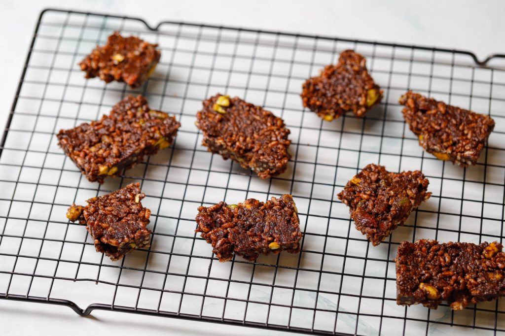 Cho hỗn hợp ra khay nướng (20 x 20 cm) có lót giấy nến, dàn đều hỗn hợp, ấn chặt và bảo quản trong tủ lạnh trong 3-4 giờ trước khi cắt thành từng thanh dài hình chữ nhật.