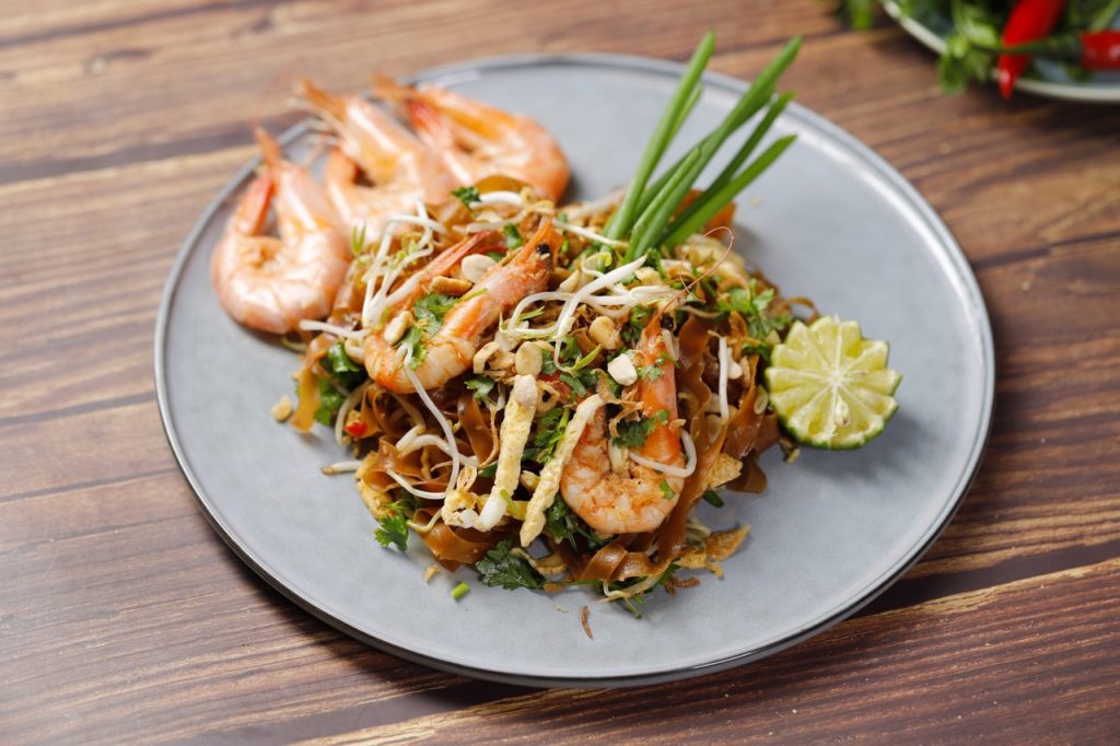 Rưới nước sốt vào bát đựng mì và giá, thêm trứng thái sợi, tôm hấp vào bát, trộn đều cho các nguyên liệu hoàn quyện với sốt. Cho pad Thái ra đĩa, trang trí thêm ½ quả ớt thái sợi, lạc rang, hành lá, rau mùi ta, hành phi, chanh bổ múi cau trước khi thưởng thức.