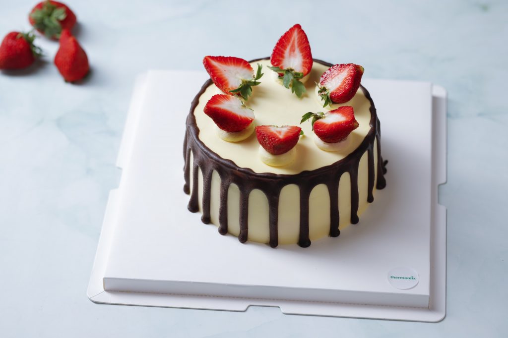 Dùng túi bắt kem bơm kín bánh từ dưới lên trên, sau đó dùng dụng cụ chà láng theo hình dạng của bánh cho bề mặt kem phẳng mịn. Dùng đui bắt kem, bơm 6 bông kem hình tròn lên trên bề mặt bánh, nhẹ nhàng đặt dâu tây lên để trang trí.