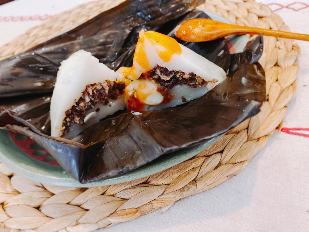 Xếp chồng 2 cái lá chuối (dài khoảng 25 cm mỗi lá) lên nhau, 1 lá có mặt bóng úp xuống dưới để nằm ngang và 1 lá có mặt bóng ngửa lên trên nằm dọc. Bôi chút dầu ăn chống dính lên trên lá, xếp gập lá theo hình khum. Dùng thìa đã nhúng qua nước dùng gà để chống dính, từ từ xúc bột vào phần đáy và tán bột mỏng đều. Cho tiếp phần nhân thịt và trứng cút vào giữa, rồi thêm một lớp bột lên trên nhân, tán đều bột cho mỏng rồi gói bánh lại. Có thể gập mép lá xuống ngay ngắn hoặc dùng dây lạt/dây sợi để buộc bánh. Lặp lại thao tác với số nguyên liệu còn lại.