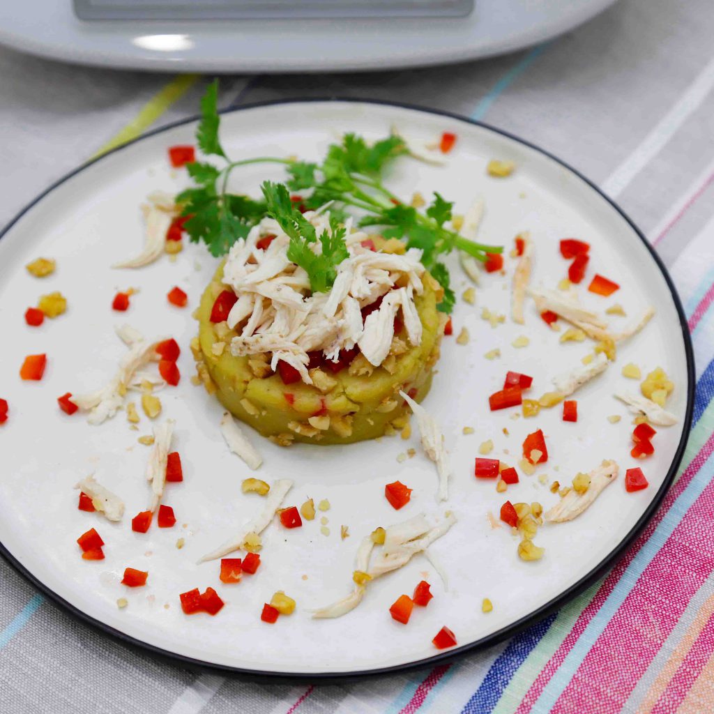Đặt khuôn tròn lên 1 cái đĩa, cho khoai lang xay vào khuôn, ấn mạnh để tạo thành hình bánh. Nhấc khuôn ra, rắc lên trên 1 lớp ớt chuông băm nhỏ, lườn gà xé, lá rau mùi, xung quanh là hạt óc chó bóp vụn. Thưởng thức ngay.