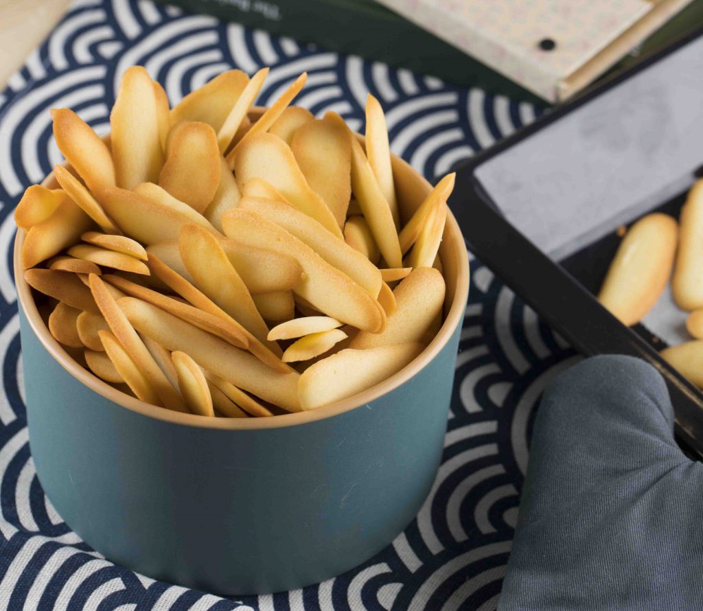 Dùng khay nướng có lót giấy nến, bắt bánh lên khay thành hình que dài, khoảng cách giữa mỗi bánh 3 cm. Nướng bánh 12-15 phút ở 160°C đến khi bánh chín vàng. Bánh sau khi nướng để nguội hẳn rồi cho vào lọ kín dùng dần trong 30 ngày.