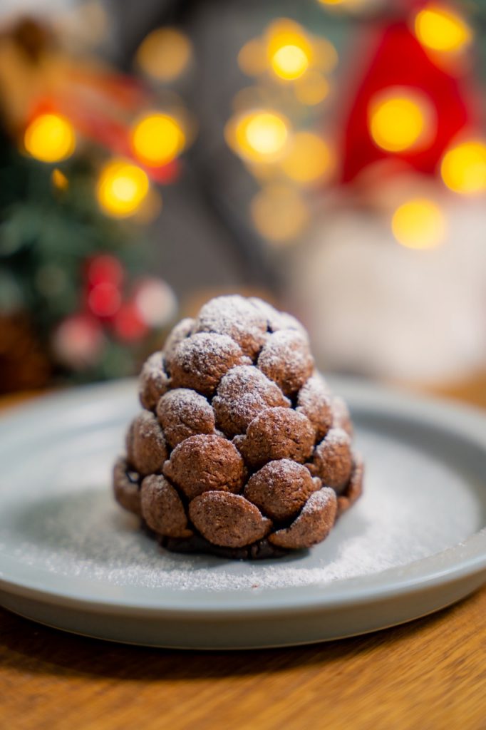 Lấy ra khoảng 75 g hỗn hợp trong bình trộn, tạo thành hình chóp giống quả thông. Gắn so le từng miếng bánh ngũ cốc vào hỗn hợp bánh để tạo thành quả thông. Lặp lại đến khi hết nguyên liệu, rắc đường xay lên trên và thưởng thức hoặc để trang trí.