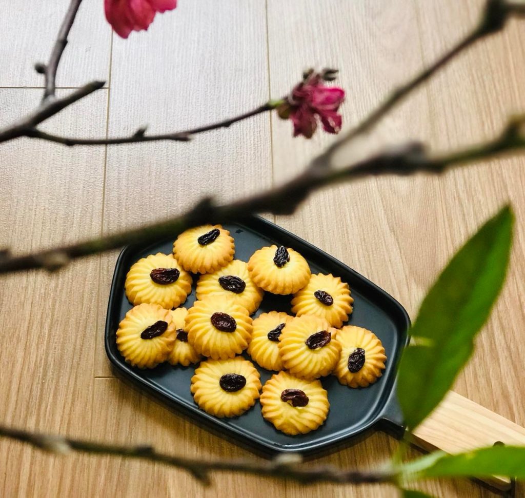 Đổ hỗn hợp ra túi bắt kem có đui hoa (không bắt buộc), bắt thành từng cái bánh tròn đường kính 3 cm lên khay nướng đã chuẩn bị. Trang trí thêm nho khô vào giữa mỗi chiếc bánh.