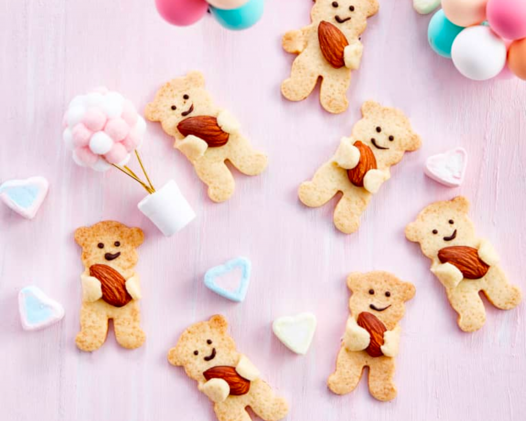 Dùng khuôn cắt bánh quy (có hình con gấu) để cắt bột và đặt lên khay nướng có lót giấy nến. Đặt một hạt hạnh nhân vào giữa miếng bột. Cẩn thận nhấc 2 tay gấu đặt lên hai bên của hạt hạnh nhân. Lặp lại thao tác với các miếng bột còn lại. Đem bánh đi nướng trong khoảng 15 phút (175°C).