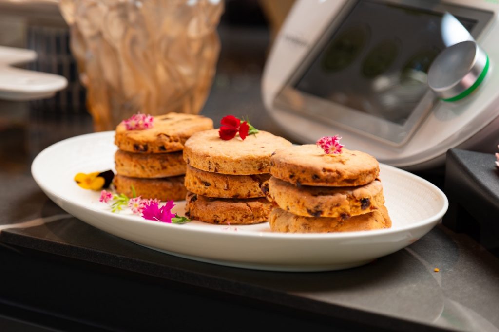 Lấy khay bánh ra để nguội. Thưởng thức bánh kèm mứt, kem tươi đánh bông cùng bột quế hoặc bơ nhạt để mềm.