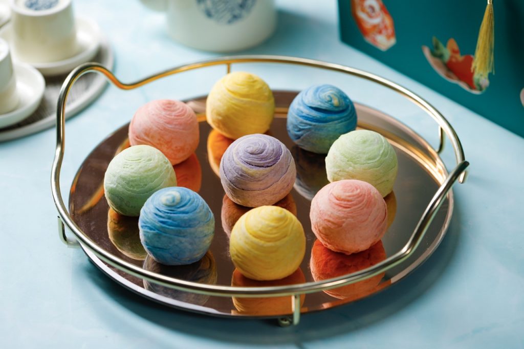 Dùng dao hoặc dụng cụ cắt bột cắt đôi miếng bột vừa cuộn, sau đó dùng cây cán bột cán bột nhẹ và mỏng theo hình tròn (khoảng 0.2 cm). Sau đó cho 1 viên nhân vào giữa, bọc kín nhân lại, bao thật nhẹ nhàng để giữ được những phần màu riêng biệt. Đặt vào khay nướng đã lót giấy nến. Lặp lại thao tác với số nguyên liệu còn lại.