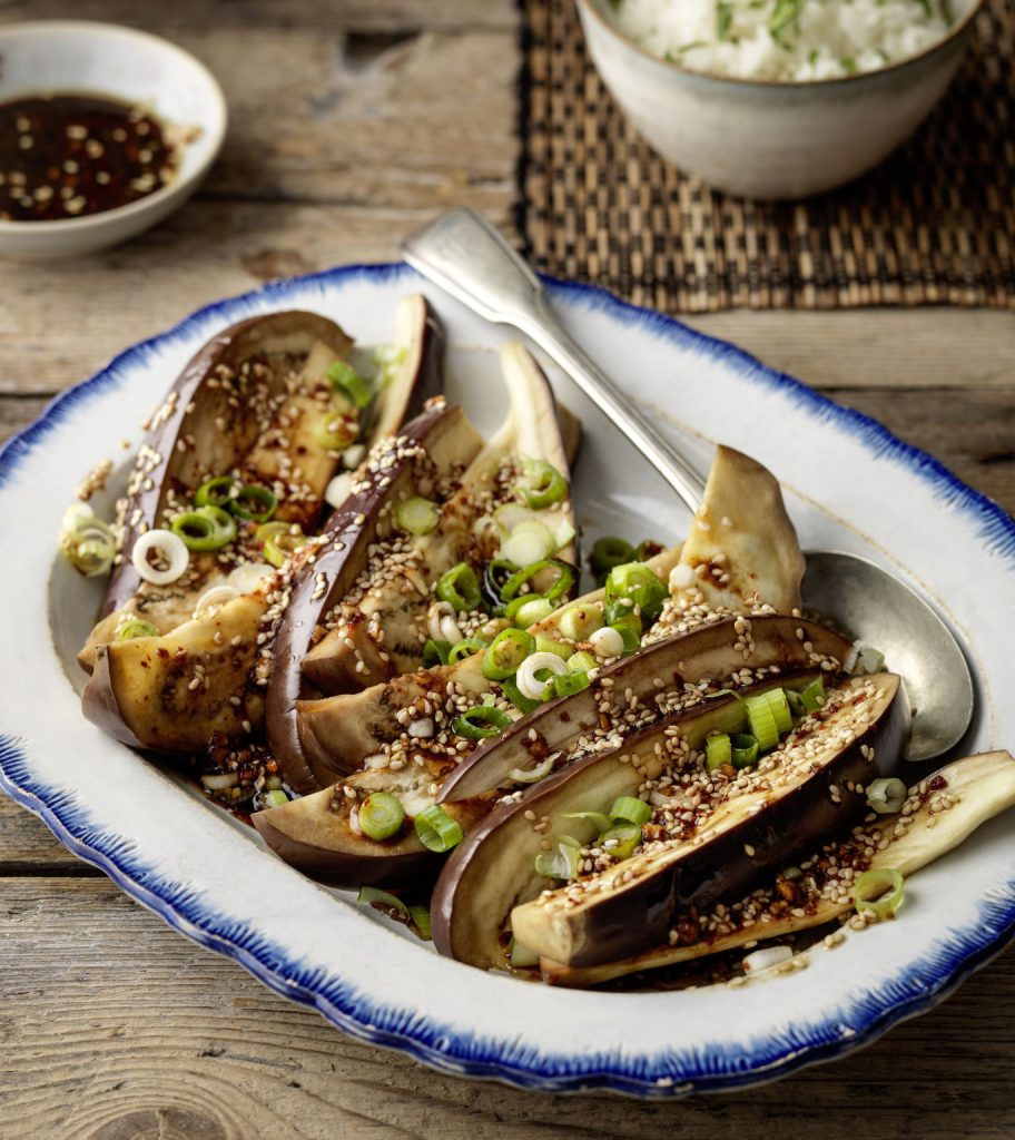 Cho cà tím ra đĩa, rưới sốt lên trên và trang trí với hành lá. Thưởng thức khi còn ấm.