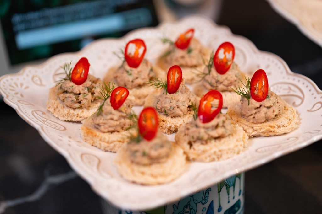 Trang trí lá thì là tươi và lát ớt lên trên mỗi miếng tapenade, thưởng thức ngay.