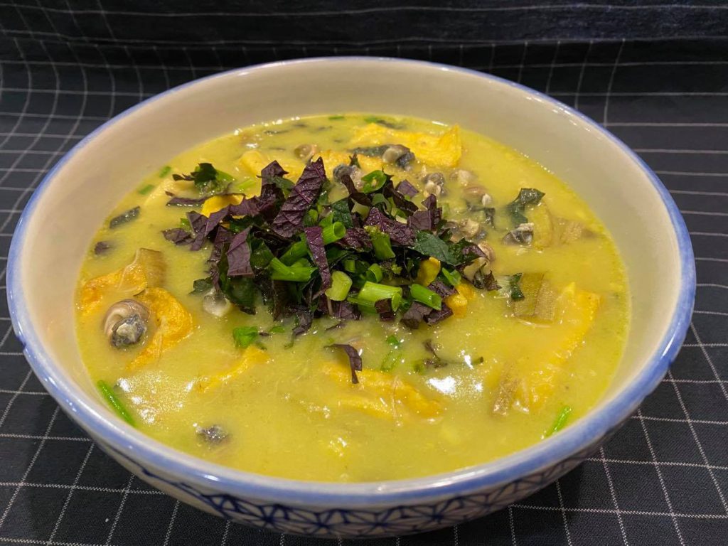 Cho tiếp nước luộc ốc, thêm nước sôi để nước trong bình chạm đến vạch 1 lít (điều chỉnh tùy khẩu vị). Thêm đậu phụ chiên vào bình trộn nấu 10 phút/100°C/(/tốc độ x. Khi đồng hồ còn 1 phút, cho ốc xào và hành lá, tía tô qua lỗ trên nắp bình trộn. Múc ra bát, rắc thêm hành lá, tía tô lên trên để trang trí, thưởng thức nóng.