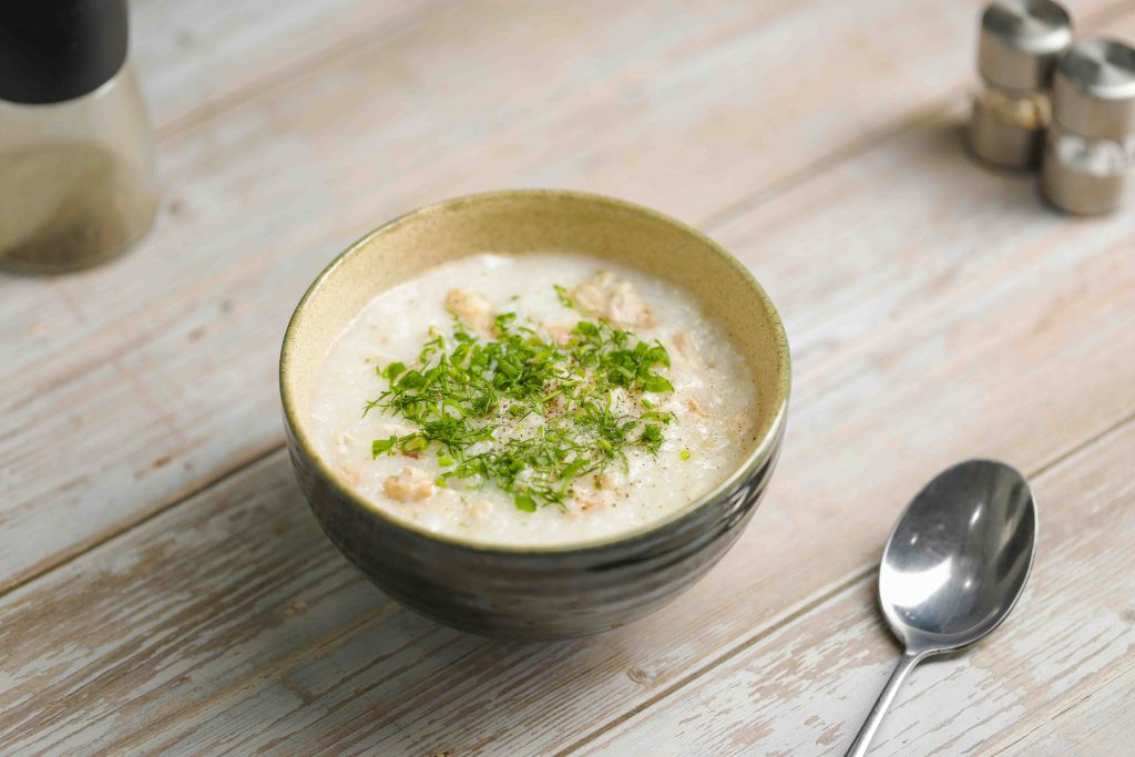 Múc cháo ra bát, thêm hành lá, thì là, rắc bột tiêu, thưởng thức nóng