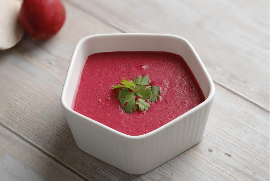 Nhấc bộ Varoma ra, cho củ dền, khoai môn đã hấp vào bình trộn, đậy nắp cốc đong và xay 20 giây/tốc độ 5 – 10, tăng dần tốc độ. Gạt nguyên liệu trên thành bình trộn xuống, xay thêm 20 giây/tốc độ 5 – 10, tăng dần tốc độ.