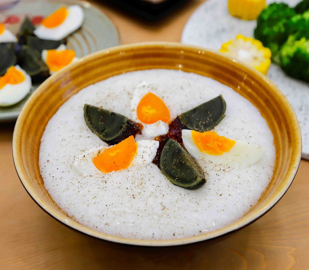 Múc cháo ra bát và xếp trứng lên, rắc bột tiêu tùy khẩu vị, thưởng thức nóng.