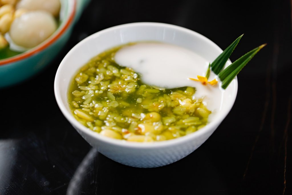 Múc chè ra bát và thêm 1 thìa nước cốt dừa lên trên trước khi thưởng thức.