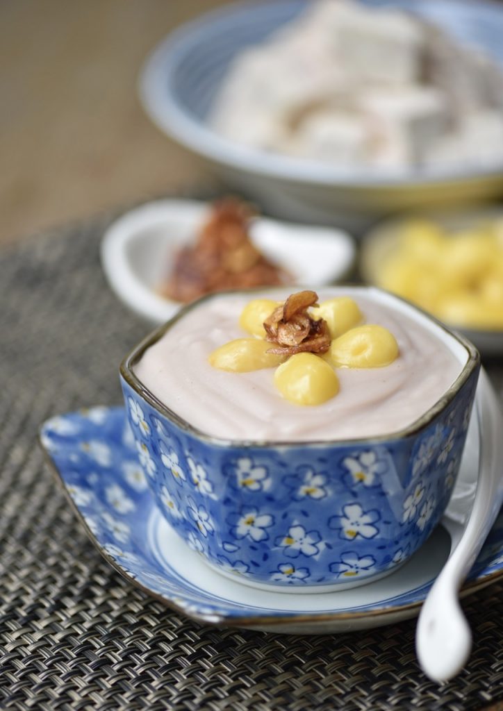 Thêm đường và dầu ăn vào, bắt đầu chế độ Xay/1 phút/tốc độ 8 cho đến khi hỗn hợp nhuyễn mịn. Chia đều chè khoai môn ra bát, trang trí với hạt bạch quả và thưởng thức nóng.