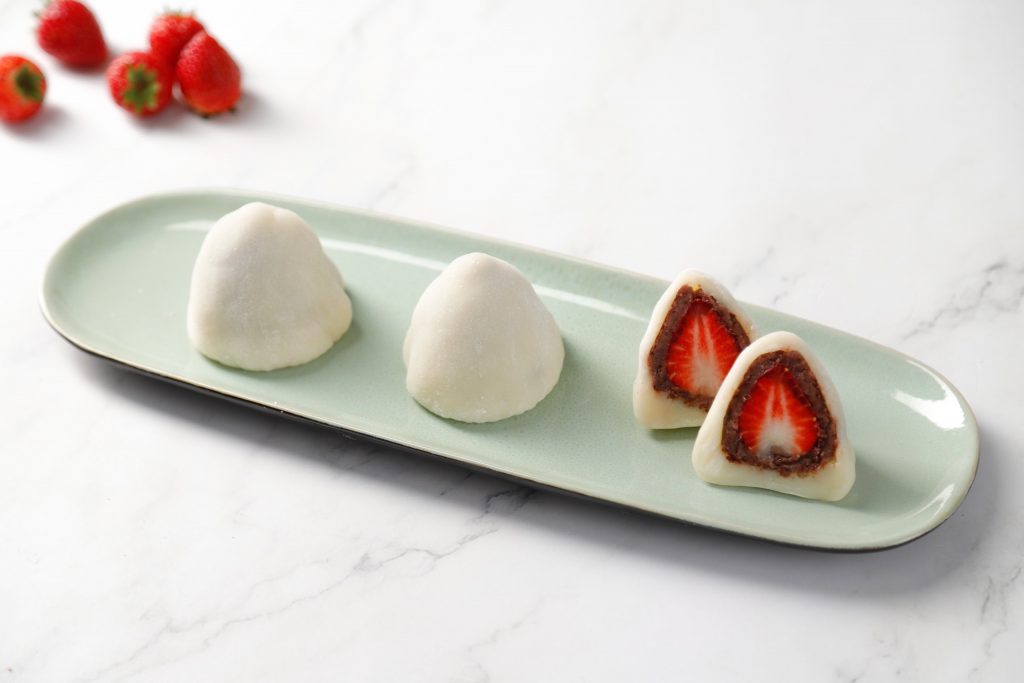 Chia đậu đỏ đã nguội thành 10 phần bằng nhau. Lấy một phần đậu đỏ bọc kín một quả dâu tây. Sau đó lấy một viên bột, xoa một lớp mỏng bột ngô lên viên bột, dùng cây cán bột cán mỏng bột đủ để bọc kín phần dâu tây và đậu đỏ. Đặt phần đỉnh nhọn của quả dâu tây vào giữa miếng bột, bọc bột bao kín phần dâu tây và đậu đỏ. Xoa bột áo xung quanh chiếc bánh. Lặp lại thao tác với các phần nguyên liệu còn lại.