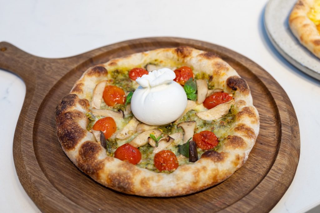 Phết sốt pesto lên bề mặt bánh pizza và thêm nấm, cà chua bi, phô mai mozzarella lên trên cùng. Cho bánh pizza vào khay nướng có lót giấy nến, nướng bánh trong khoảng 5 phút (250°C) đến khi đế bánh chín đều. Lấy bánh ra, trang trí thêm phô mai tươi và thưởng thức nóng.