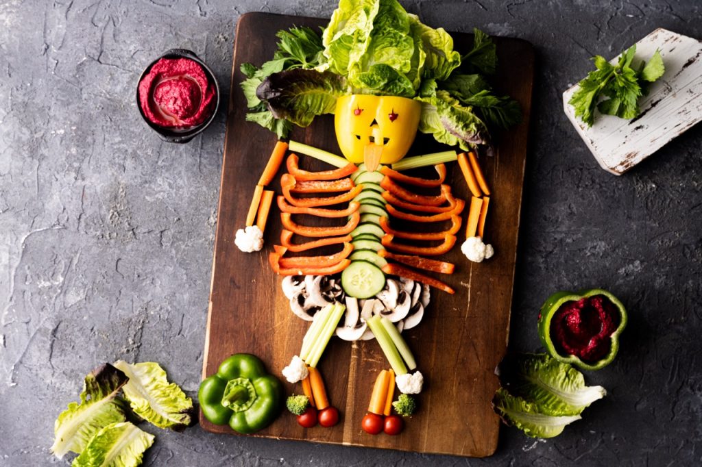 "Mặt" làm từ ớt chuông, cần tây và cà rốt làm "cánh tay" và "chân", dưa chuột cắt lát làm "xương sống", ớt chuông đỏ làm "xương sườn", nấm làm "xương hông", bông súp lơ trắng làm "tay" và "chân", rau xà lách để làm "tóc". Xếp tất cả lên trên đĩa hoặc thớt lớn (nhỏ nhất 30 cm x 40 cm) để tạo thành hình bộ xương. Dùng hạt lựu để làm "mắt". Trang trí với nắp quả ớt chuông xanh.