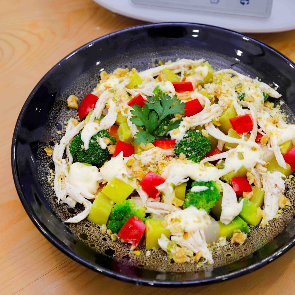 Xếp rau củ ra đĩa, thịt gà xé miếng nhỏ, xếp lên trên. Rưới sốt mayonnaise lên trên rồi rắc hạt tùy khẩu vị, trang trí với mùi tây. Trộn đều và thưởng thức.
