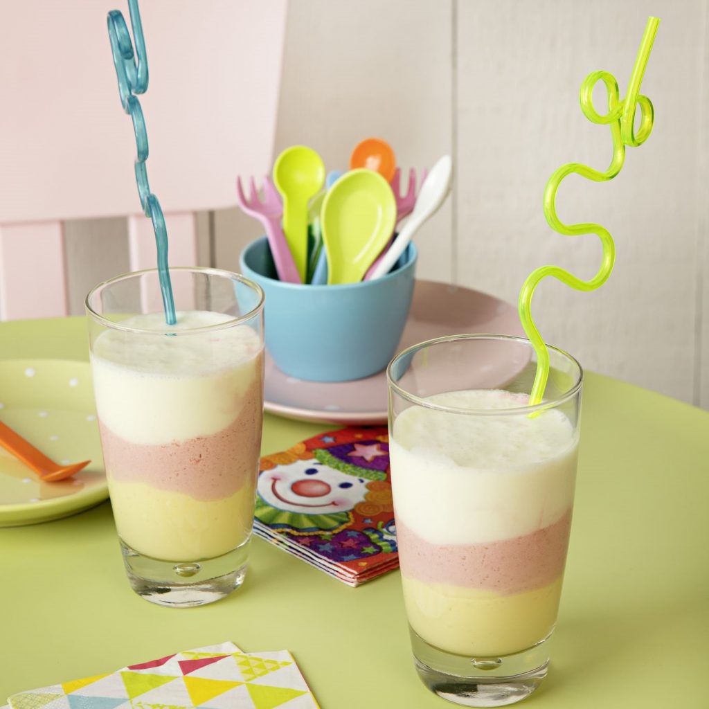 Cho toàn bộ nguyên liệu vào bình trộn và xay nhuyễn 1 phút/tốc độ 5-10, tăng tốc độ dần đều. Chia đều ra 6 chiếc cốc, rót từ từ lên trên lớp sinh tố dâu. Thưởng thức ngay.