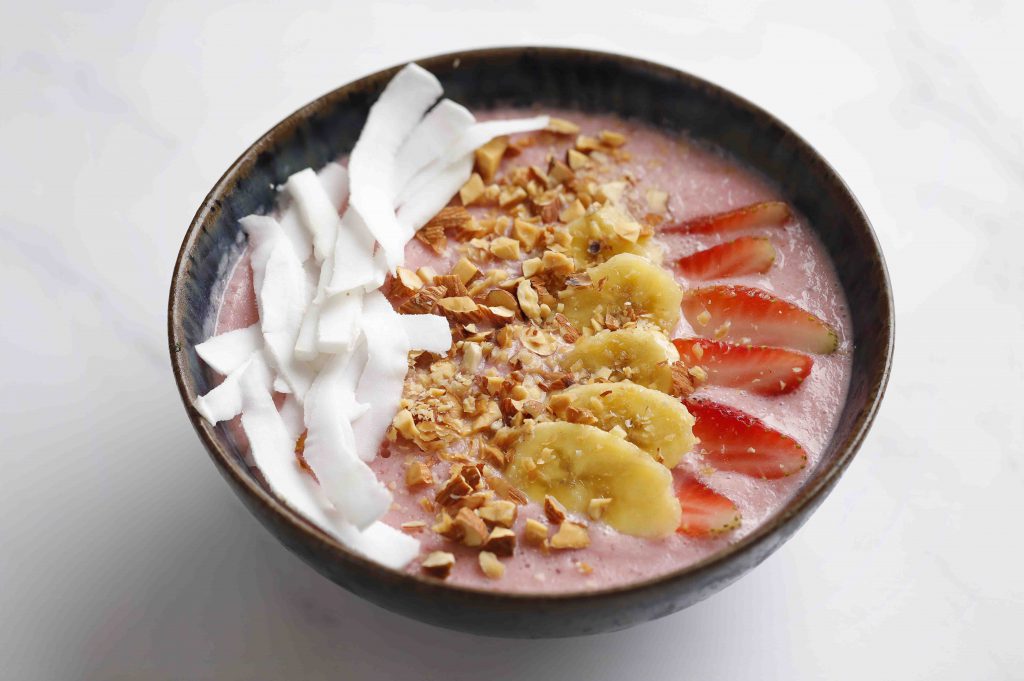 Cho ra bát, trang trí với dâu tây, yến mạch, hạt chia, chuối, dừa nạo, hạnh nhân. Thưởng thức ngay