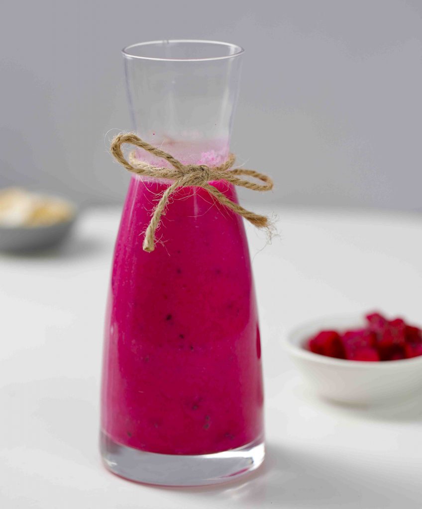Để nhiệt độ trong bình nguội bớt, thêm thanh long, xay nhỏ 1 phút/tốc độ 8-10 cho đến khi nhuyễn mịn. Rót ra cốc và thưởng thức ngay.