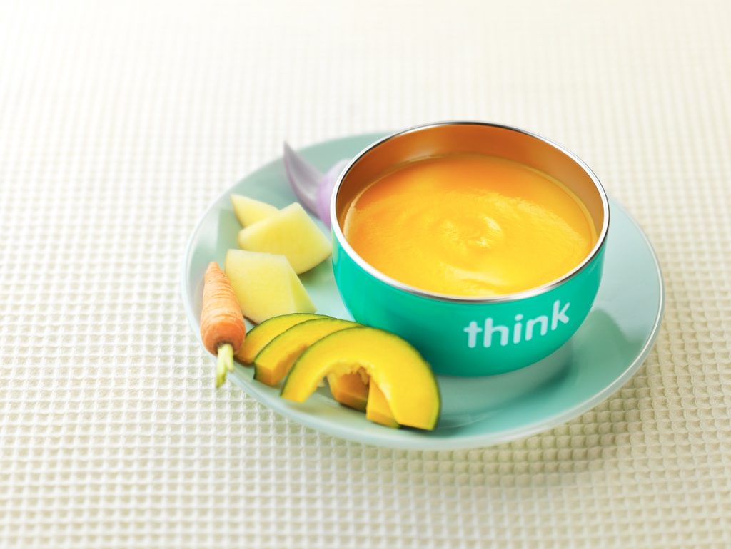 Cho bí ngô, khoai tây, táo và nước vào bình trộn, nấu 20 phút/100°C/tốc độ 1. Sau đó xay 10 giây/tốc độ 7, thưởng thức ngay nếu cần hoặc chia đều vào khay đá viên để bảo quản đông lạnh.