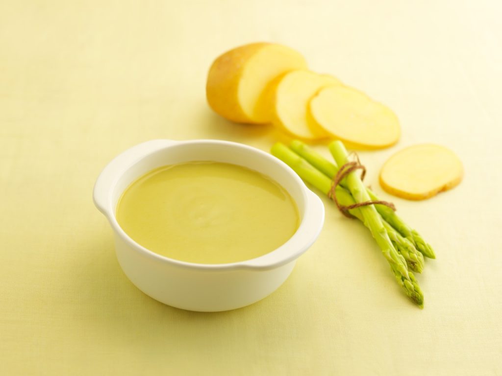 Cho dầu óc chó, măng tây và khoai tây vào bình trộn, xào 3 phút/100°C/tốc độ 1.