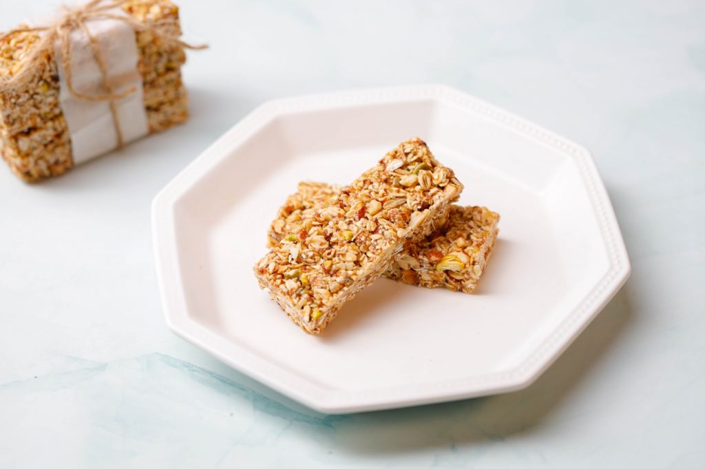 Thêm hạt hướng dương, yến mạch vào, trộn đều 10 giây/(/tốc độ 2. Đổ hỗn hợp ra khay nướng có lót giấy nến, dàn đều ra và cho vào lò sấy trong 20 phút (150°C).