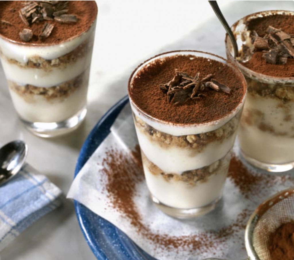Lấy bánh từ trong tủ lạnh ra, rắc một lớp bột cacao lên trên và thưởng thức lạnh.