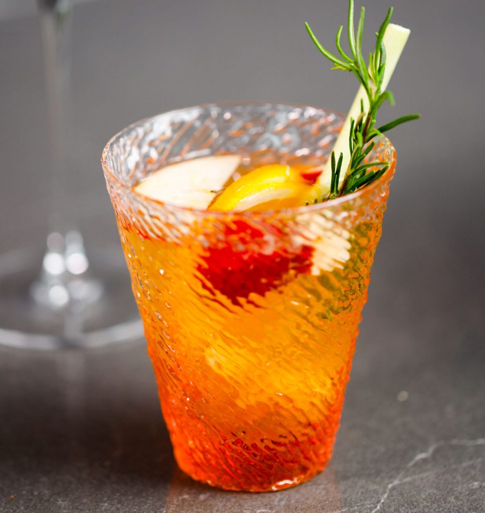 Cho 150 ml trà ủ lạnh với 1 thìa canh hoa quả, 1 thìa canh sốt vào cốc và ngoáy đều. Thêm đá, tùy khẩu vị và trang trí cốc với chanh vàng, cam vàng thái lát mỏng, nhánh hương thảo tươi. Thưởng thức ngay.