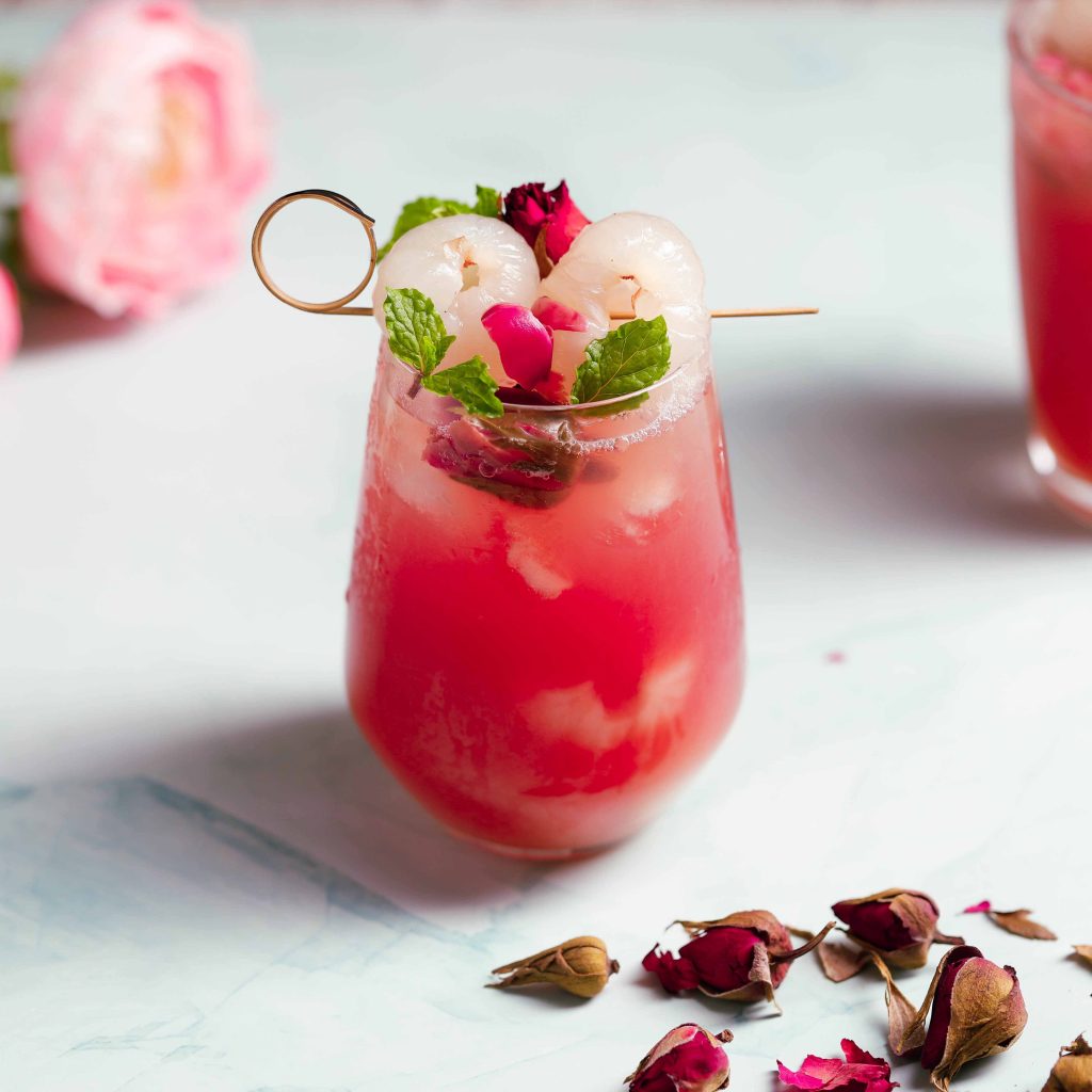 Cho nước trà hoa hồng, nước vải tươi, syrup hoa hồng và đá viên vào bình trộn, trộn đều 10 giây/(/tốc độ 4.