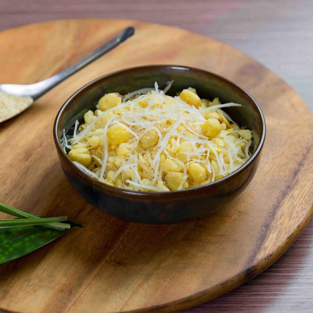 Để bộ Varoma sang một bên quạt hoặc để vào ngăn mát cho xôi, đỗ nguội và khô lại. Cho xôi ra bát hoặc đĩa, thêm nước cốt dừa, 70 g đường và trộn thật đều cho tơi rồi để nguội. Rửa sạch và lau khô bình trộn.