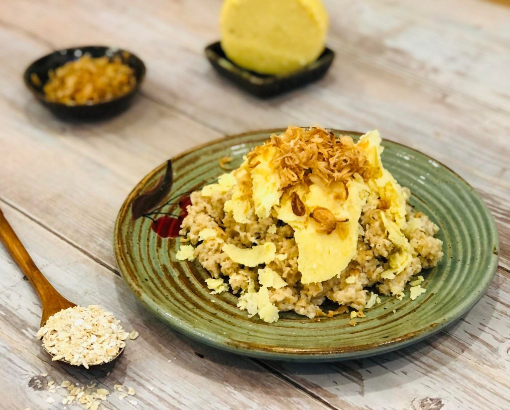 Cho thêm chút dầu ăn của hành phi vào yến mạch hấp chín và trộn đều. Khi ăn cho yến mạch ra đĩa hoặc bát, thái đỗ thành từng lát thật mỏng lên trên, cuối cùng là rắc một chút hành phi lên trên và thưởng thức.